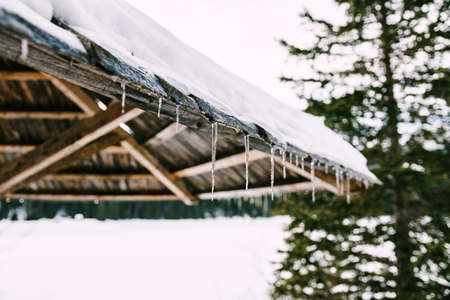 A wooden canopy with icicles and snow by a tall tree with a shallow depth of field.