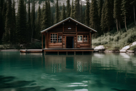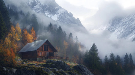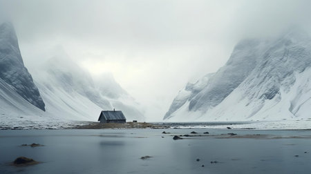 an isolated mountain hut by a misty lake, created with generative ai