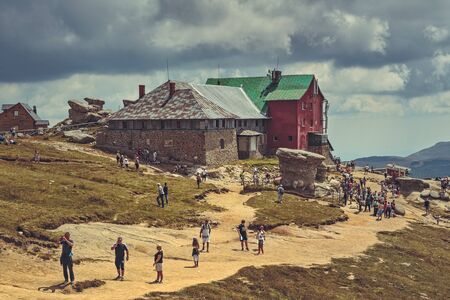 Bucegi Mountains, Romania - August 6, 2016: Thousands of tourists hike the trails to the Babele (The Old Women) chalet at 2206 m altitude in Bucegi Mountains to visit the Babele Rocks and the Sphinx.