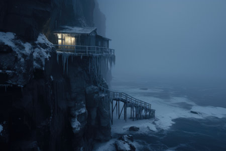 A cabin by cliff by sea at night in winter covered by heavy snow and ice. Winter seasonal concept. AI generated.