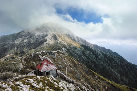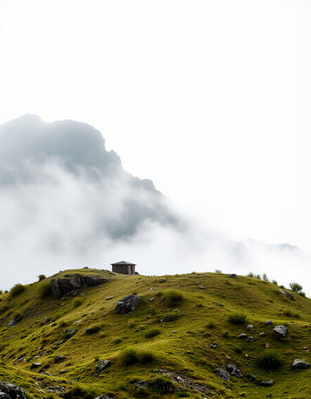 Mountain landscape with a small hut in the middle of the clouds