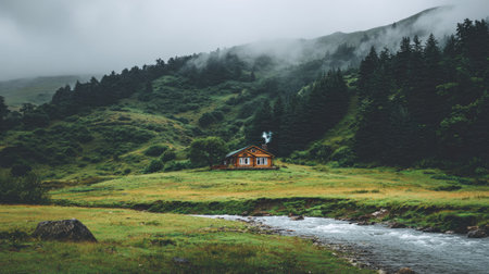 A small cabin sits on a green meadow beside a flowing river. Dense, dark green trees cover the slopes of a mountain shrouded in mist. The scene displays a rustic aesthetic with natural tones. Suitable for editorial projects and potentially for illustrating concepts of tranquility and solitude in nature.