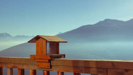 A closeup shot of a decorative wooden house on a balcony fence with a foggy mountain in the background