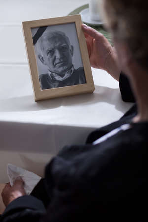 senior woman covering face with hand and crying while looking at frame with man on photograph