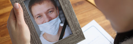 Close-up of a black ribbon resting on a memorial photo frame, surrounded by personal photographs, creating a serene atmosphere of remembrance and loss