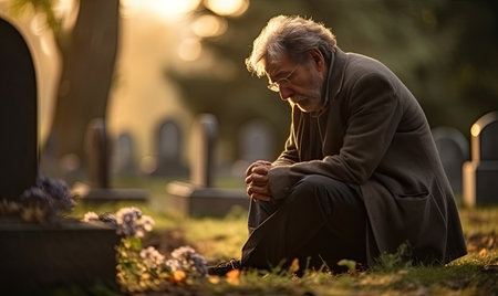 Tearful old woman with bouquet at a grave under cloudy sky. AI generated