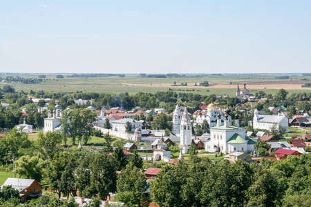 Rural landscape, field, houses and Church into the distance, Suzdal, Golden Ring, Russia
