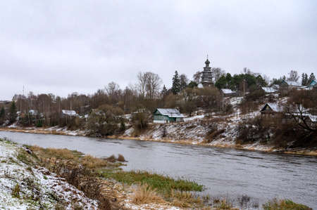 beautiful landscape overlooking embankment with small houses and an old wooden temple in late autumn. Architecture of small town Torzhok. Russia. Tver region