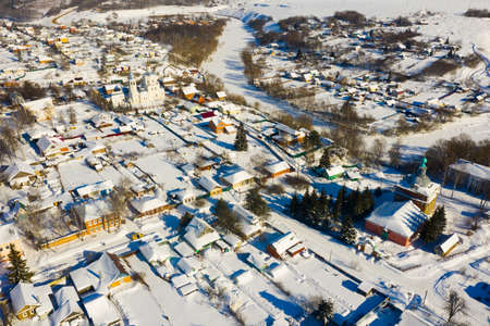 Aerial drone view of ancient russian town Ples on the Volga river in winter with snow, Ivanovo region.