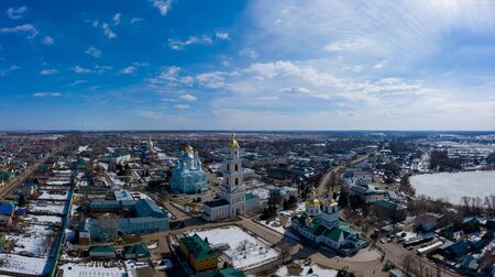 Aerial view of the Nativity-Bogoroditsky monastery surrounded by residential buildings in Zadonsk