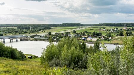 View from the hill to the Russian village. On the background of the Volga River. Beautiful weather.