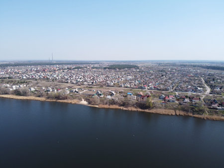 Arial view over the river and small village at sunset. Dniester river of Moldova republic.