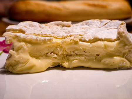 French soft Camembert cheese, original Camembert de Normandie, close up with white mold