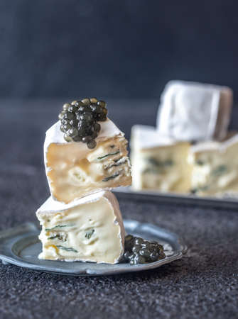 White and blue mold soft cheese with black caviar close-up