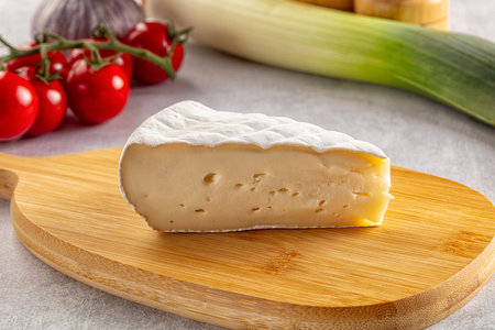 Brie cheese. White soft cheese with white mold on cutting board.