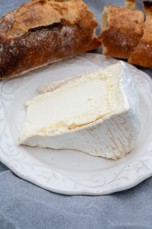 Delice de Bourgogne French cow's milk cheese from Burgundy region of France close up served outdoor with baguette