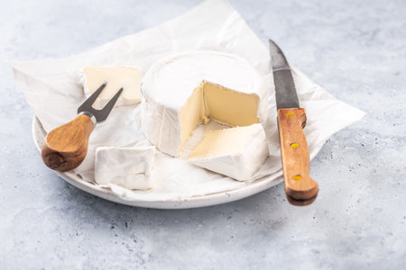 Organic camembert cheese with knife and fork on kitchen table