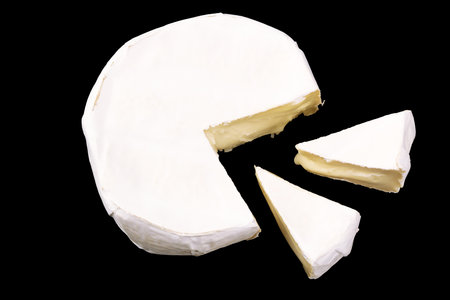 Camembert with slices isolated on black background. Soft cheese covered with edible white mold view from above. top view