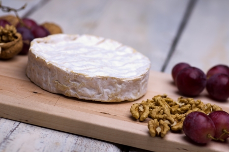 Cheese with white mold and grapes on a wooden cutting board. Food background.
