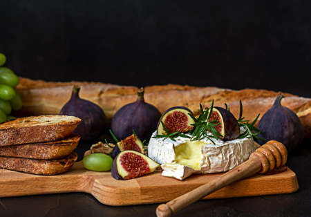Oven baked Camembert cheese with honey, figs, and fresh baguette. Delicious gourmet snack