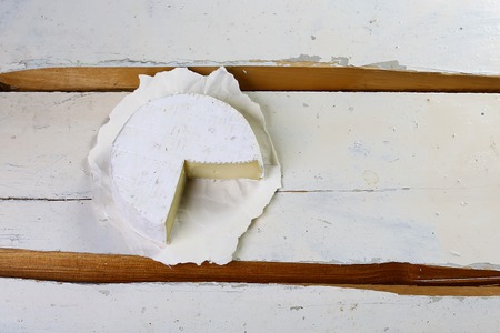 Camembert cheese on a wrapping paper. French cheese with mold on the surface.