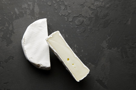 Camembert cheese halves on black stony table background, top view, italian food