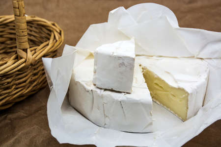 Brie cheese on vintage parchment. Camembert cheese with wooden basket next to it. Italian, French cheese.