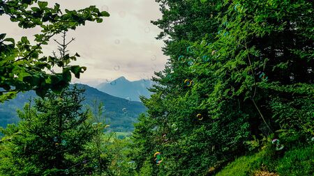 Soap bubbles flying in the forest in Ludmansdorf, Kathreinkogel, Schiefling am See. The backdrop is Alps. Lush green forest contrasted with delicate bubbles. Colors of the rainbow bring happiness.