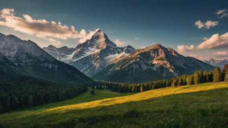 Panoramic view of beautiful alpine meadows and mountains in summer