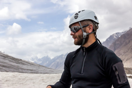 Face of Man Bearded Face Sporty Clothing Protective Sunglasses and Helmet with Mountain Landscape and Glacier on Background