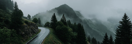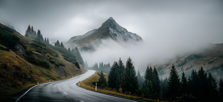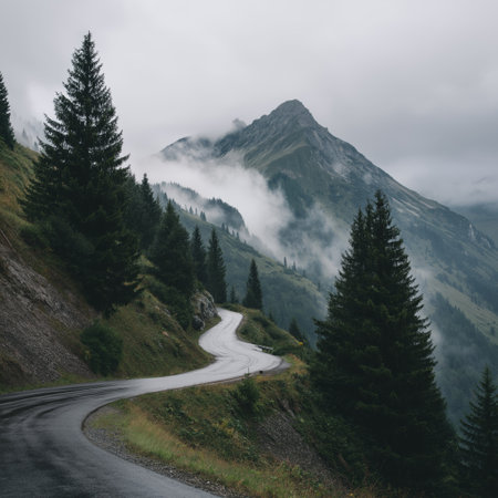 Winding asphalt road navigating through pine trees and fog, ascending towards a mountain peak. Winding mountain road leading to a foggy Alps peak