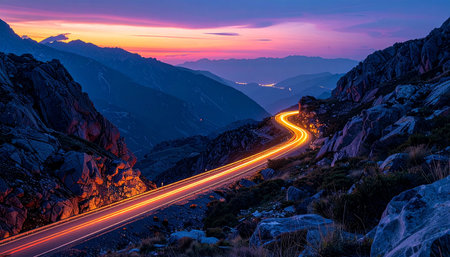 Long exposure photo of glowing car light trails illuminating a winding mountain road at dusk, creating a mesmerizing scene of movement and light