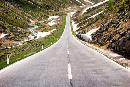 Mountain showing winding asphalt road with white lines leading through a dramatic mountain valley at dusk with snow...
