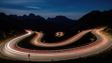 Light trails on the highway in the alps at sunset, europe travel and adventure through scenic mountain roads