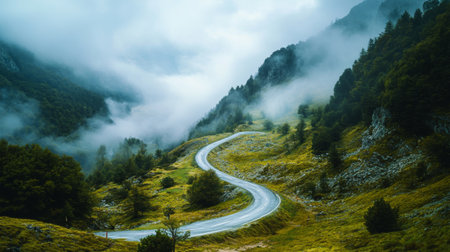 A captivating image showcasing a winding mountain path that meanders through lush greenery, shrouded in fog. This tranquil scene invites adventure and exploration.