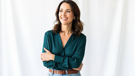 A woman is depicted smiling with her arms crossed in front of a neutral white backdrop. She wears a dark green blouse. The image presents soft lighting and a clean composition. This versatile image could be used in various commercial or editorial projects, offering copy space.
