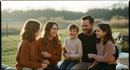 A joyful family of four holding hands and walking in a park during sunset. The scene is warmly lit with autumn colors.