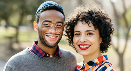 Cheerful multiracial young adult couple smiling outdoors in sunny park