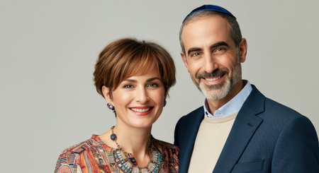 Happy middle-aged couple embracing cultural heritage in traditional attire with smiles