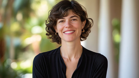 Portrait of a beautiful woman with curly hair smiling at the camera