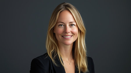 Professional woman with long blonde hair poses confidently against dark background
