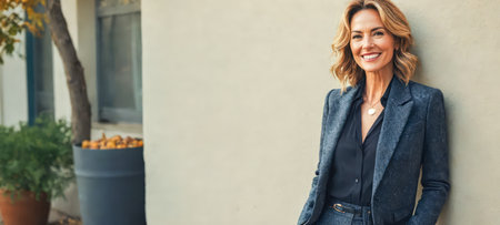 Confident adult individual outside building resting against wall, chic blazer dark blouse, blonde hairstyle visible, professional demeanor casual flair urban environment