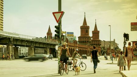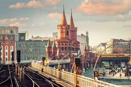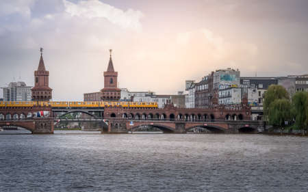 BERLIN, GERMANY - circa 2016: A panoramic view of Berliner U-Bahn with Bridge Oberbaumbruecke