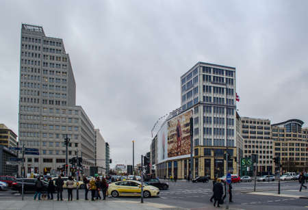 BERLIN, GERMANY, MARCH 12, 2015: people are walking through one of the commerce centers of berlin - potzdamer platz. this square was freshly built after German reunification.