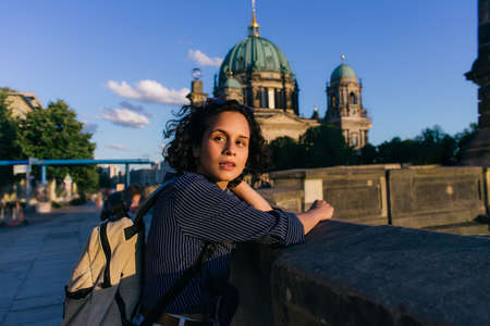 BERLIN, GERMANY - pretty young woman near blurred berlin cathedral