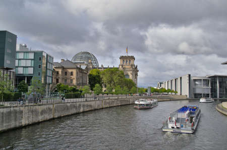 Berlin, Germany - September 18, 2021: A river tourist ferry sails along a river overlooking the Reichstag.