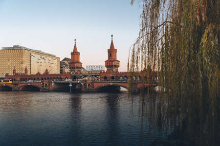 Berlin, Germany - March 03 2021: View towards Oberbaum Bridge during sunset. It is a double-deck bridge crossing Berlins River Spree, considered one of the citys landmarks