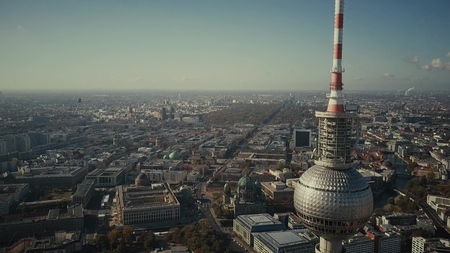 BERLIN, GERMANY - OCTOBER 21, 2018. Aerial view of famous Berliner Fernsehturm or Television Tower against beautiful cityscape