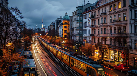 Berlin, city urban scene silhouette at sunset with people, tram and cars - Busy street in Berlin, capital city of Germany, with unrecognisable people - travel and transport