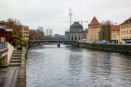 Berlin, Germany - December, 2019: View of Museum Island with famous TV tower and Spree river in center of Berlin on a foggy day.